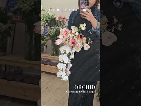 This butterfly orchid teardrop wedding bouquet, featuring pure white orchids as the main character, is paired with pink roses, peach-colored and light pink seasonal flowers, creating a rich, soft, and charming waterfall shape, adding unique charm to your wedding.